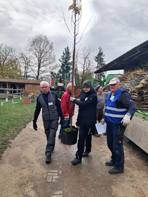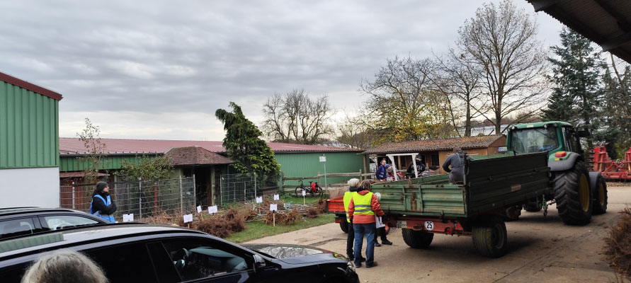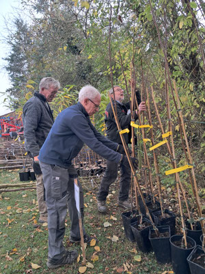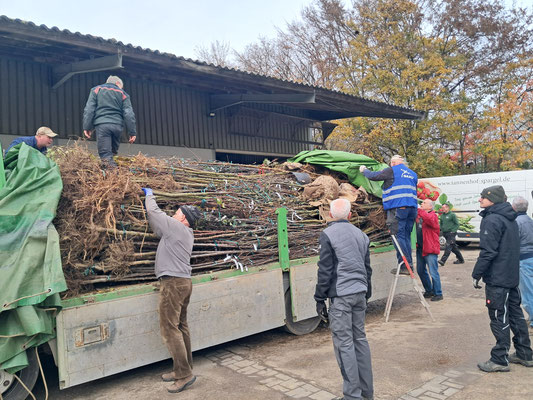 Bereits am Freitag (14.11.) wurden die Bäume von zwei verschiedenen Baumschulen aus der Umgebung angeliefert und mussten von den Helfer:innen – in diesem Jahr kam eine starke Unterstützung aus dem Ortverband Darmstadt - abgeladen und nach Sorten verteilt werden. Die Stimmung war gut, man tauschte sich und auch das Wetter war auf unserer Seite. Eine runde Sache.